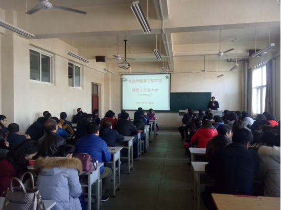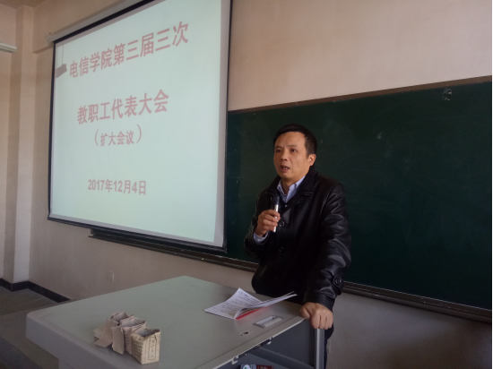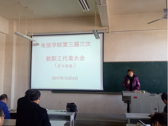 12月4日,电信公司第三届三次教职工代表大会(扩大会议)在工科5楼406教室隆重举行,公司全体领导及教师参加会议,工会主席张海宁老师主持会议。