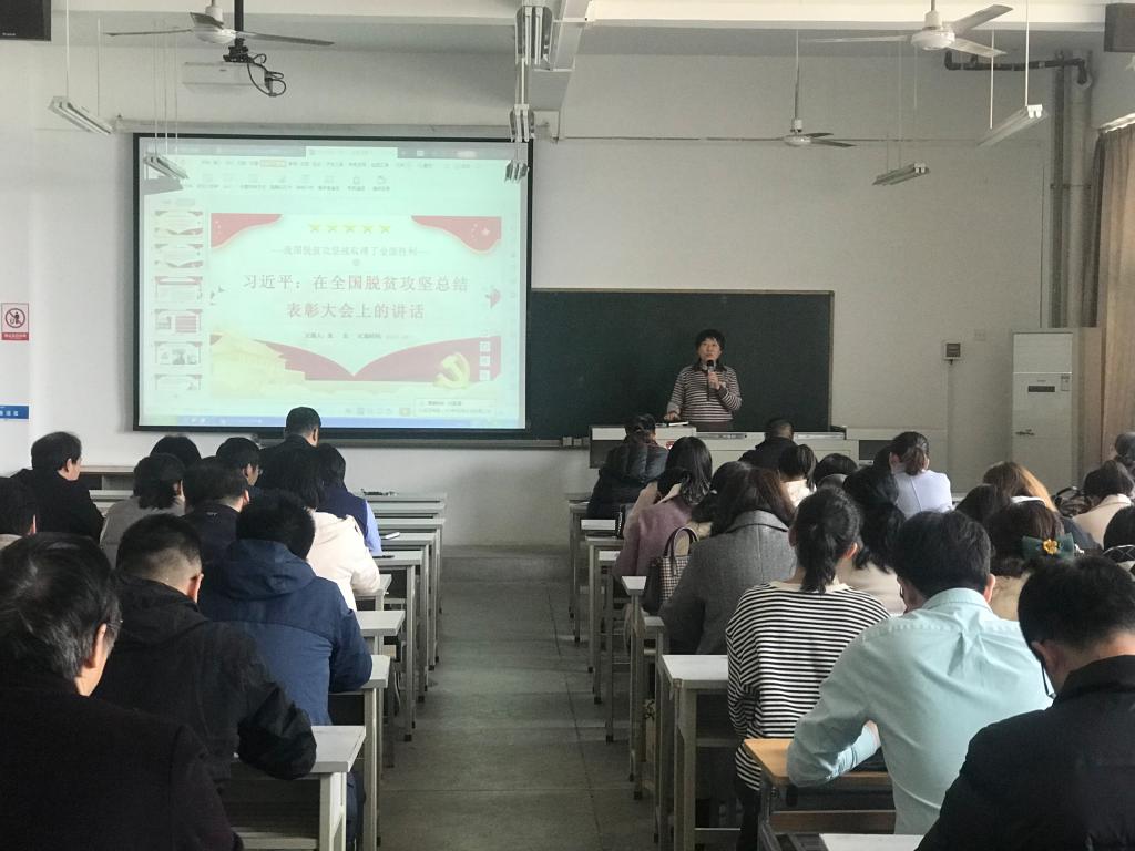 会上,张忠从中国共产党开启脱贫攻坚的历史进程,采取的措施,取得的成就,脱贫攻坚中牺牲的英雄事迹,形成的中国特色反贫困理论、脱贫攻坚精神,巩固脱贫攻坚成果和乡村振兴战略,共计7个方面,带领全体教职工学习了习近平:在全国脱贫攻坚总结表彰大会上的讲话。