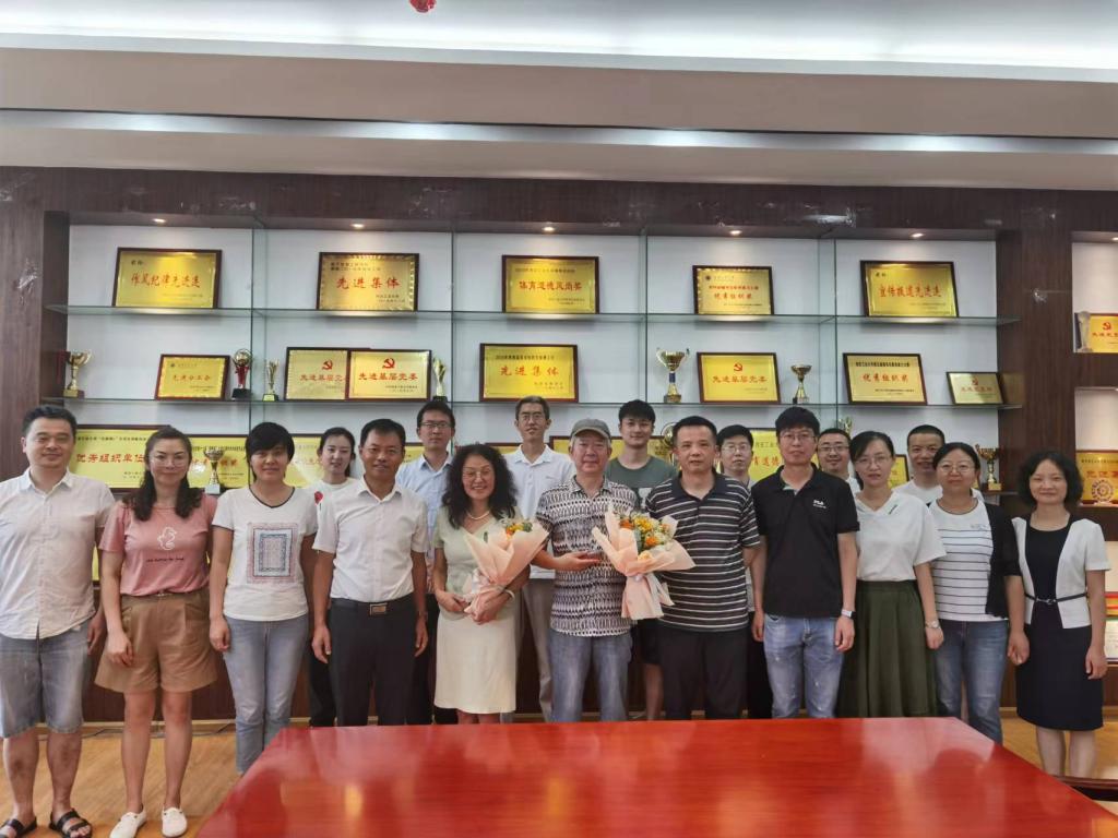 最后,易超书记代表公司为两位退休教师赠送礼物和鲜花,全体参会教师与两位退休教师合影留念。