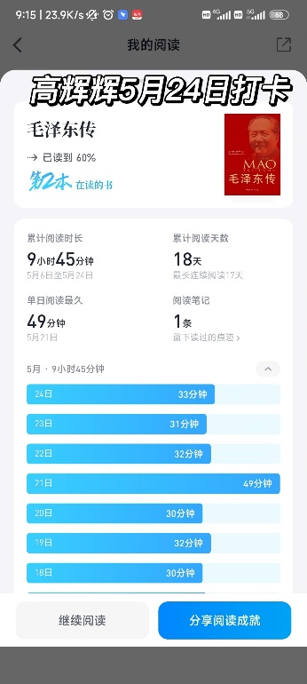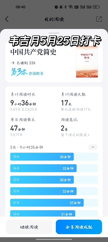 本次活动通过21天连续在规定时间内进行线上阅读打卡并最终分享读书心得的形式开展,推荐书籍为《红岩》、《把一切献给党》、《毛泽东选集》、《铁道游击队》。公司研究生踊跃报名,90余名研究生参加此次活动,借此来提高自己的思想水平。参加活动的研究生每日阅读后坚持按时打卡,认真记录读书心得。