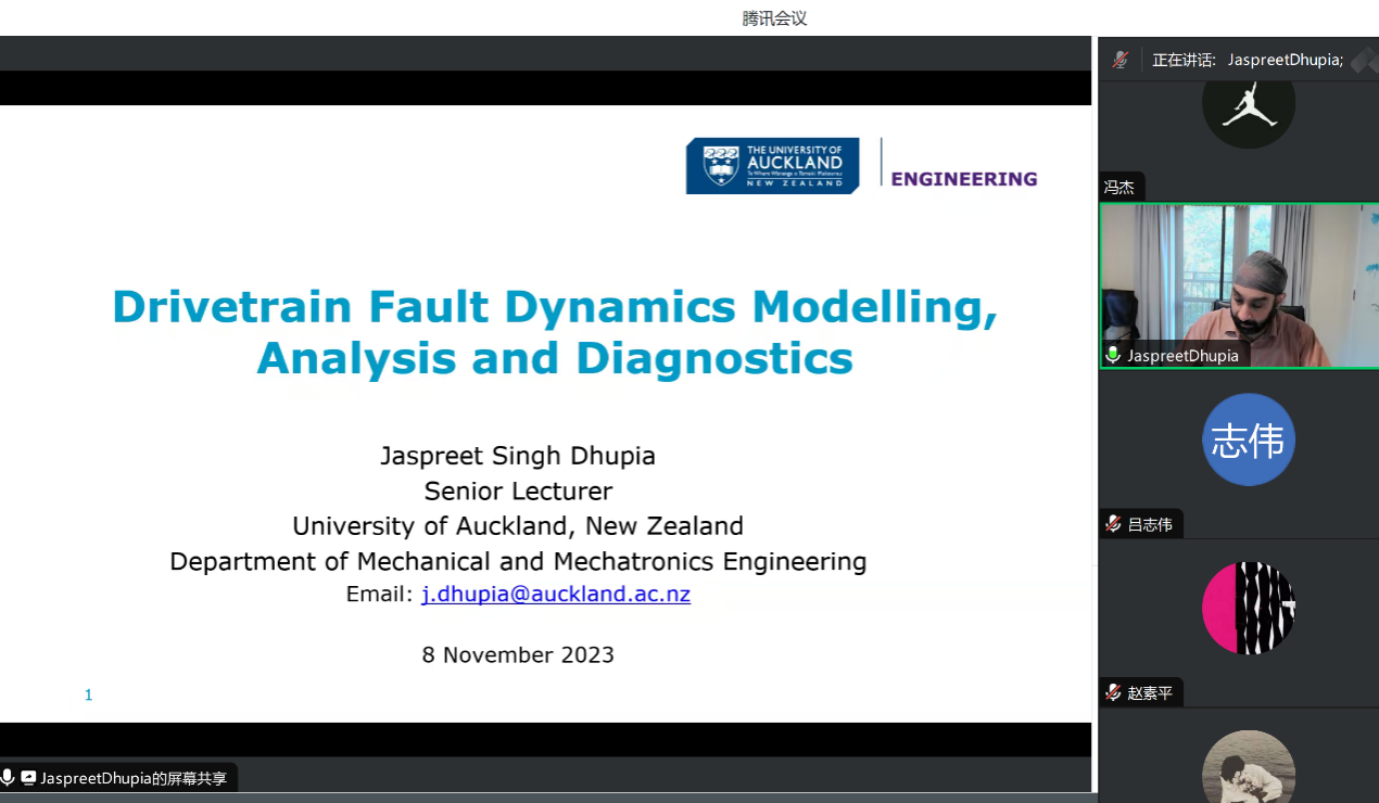 2023年11月8日下午,太阳成tyc122cc邀请新西兰奥克兰大学高级讲师Jaspreet S. Dhupia博士做了题为“传动系故障动力学建模、分析与诊断”的报告。